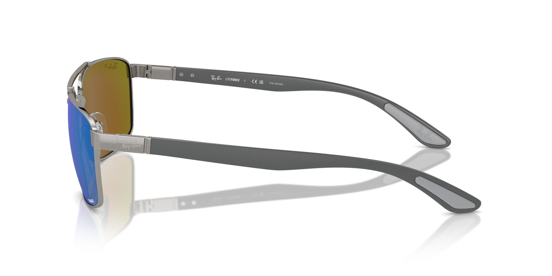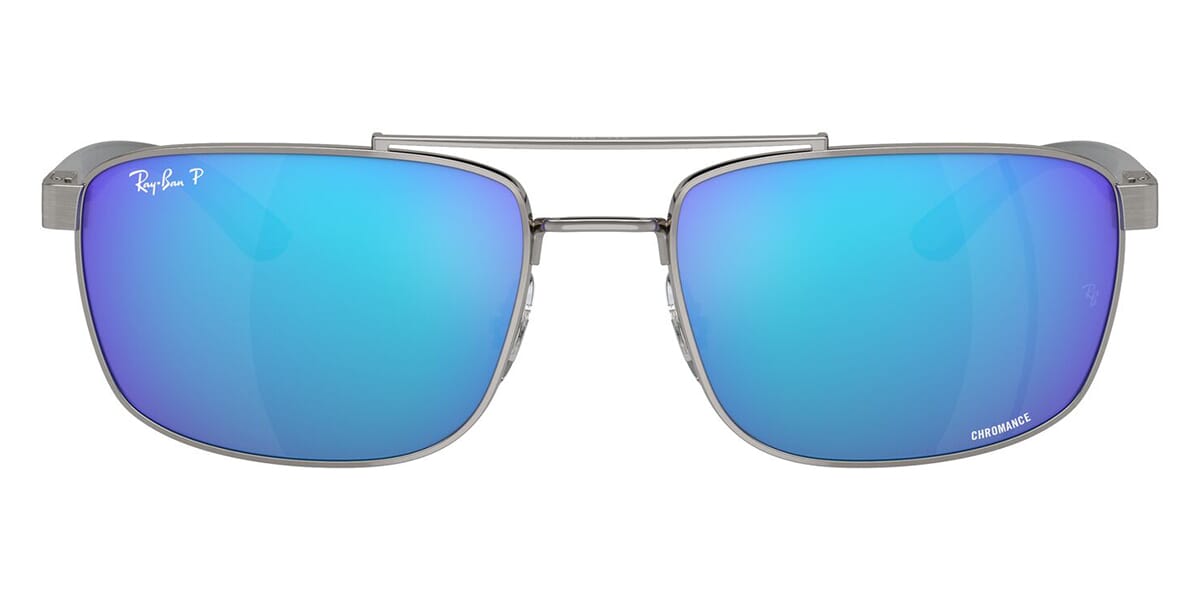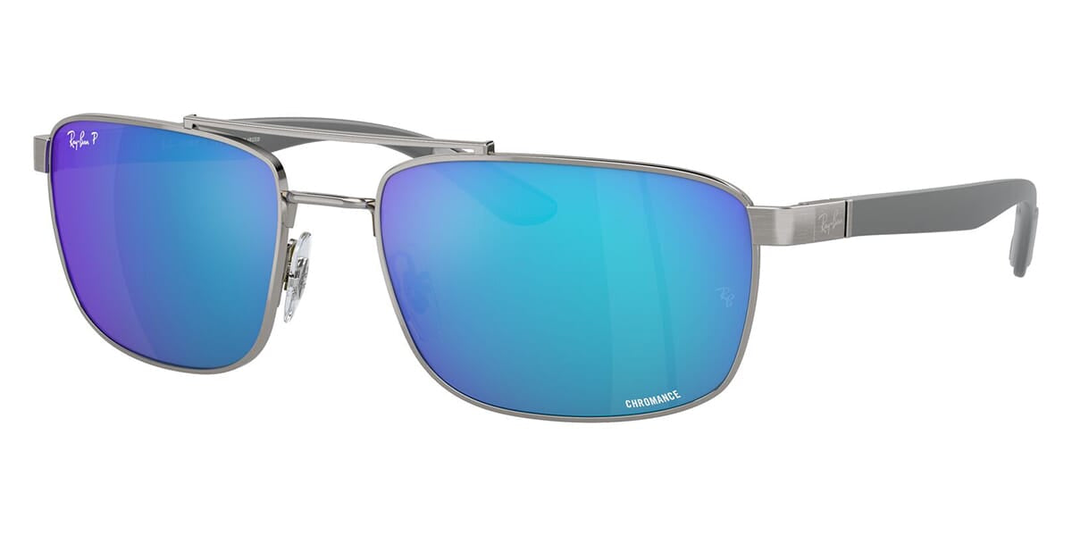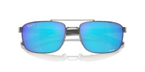 This rectangular Ray-Ban sunglass comes in a gunmetal frame with green with blue mirror polarised lenses.
