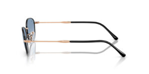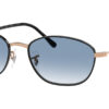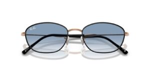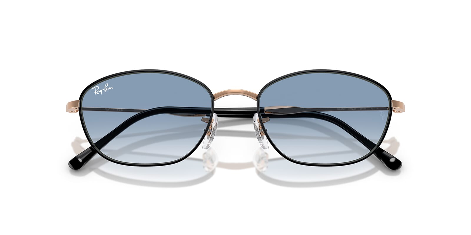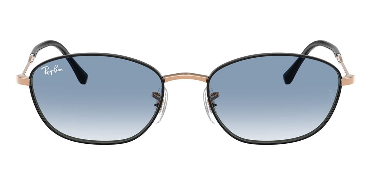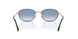 This rectangular Ray-Ban sunglass comes in a black on rosegold frame with blue to clear gradient lenses.