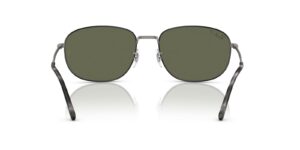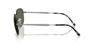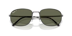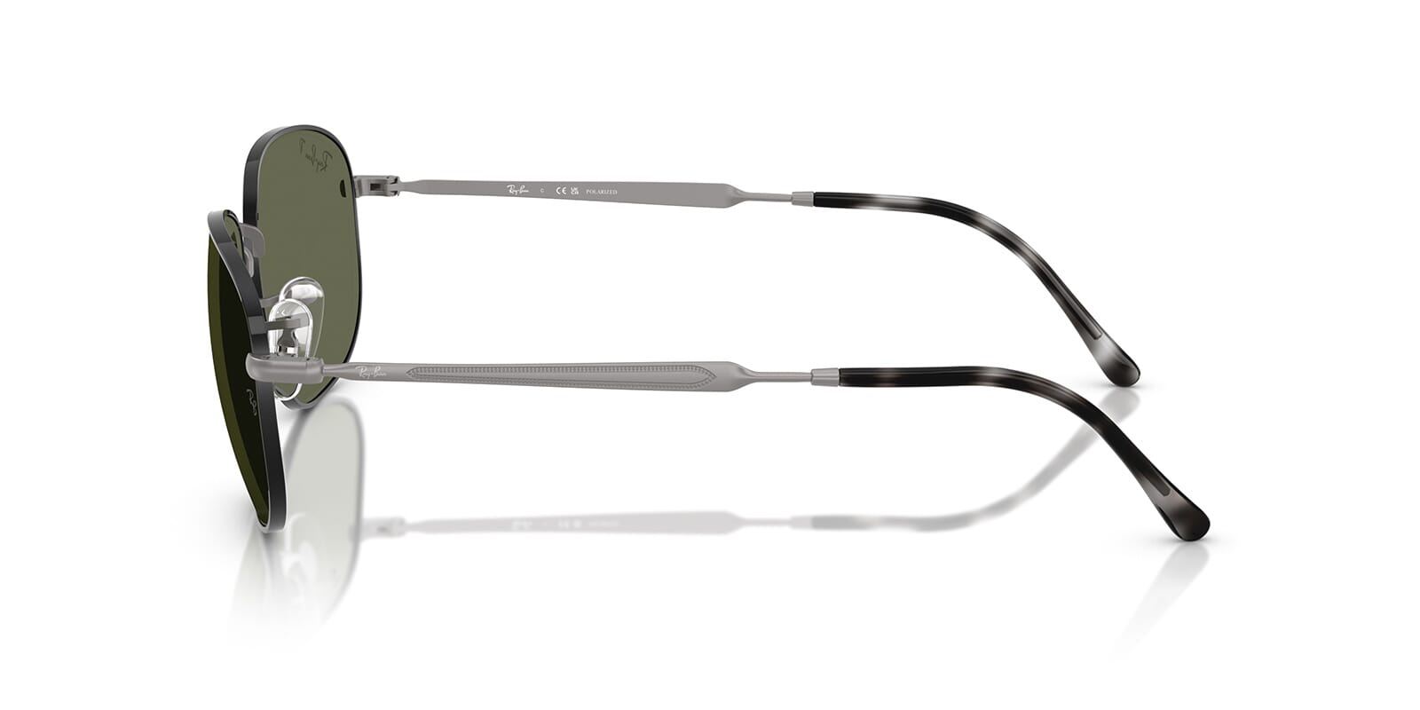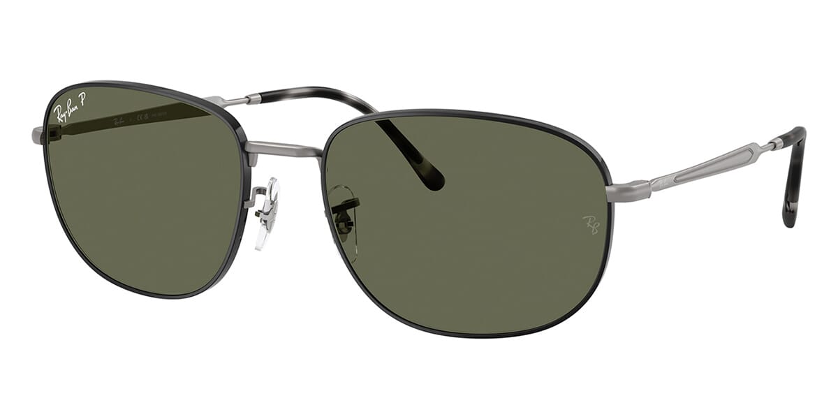 This square Ray-Ban sunglass comes in a matte black on matte gunmetal frame with green polarised lenses.