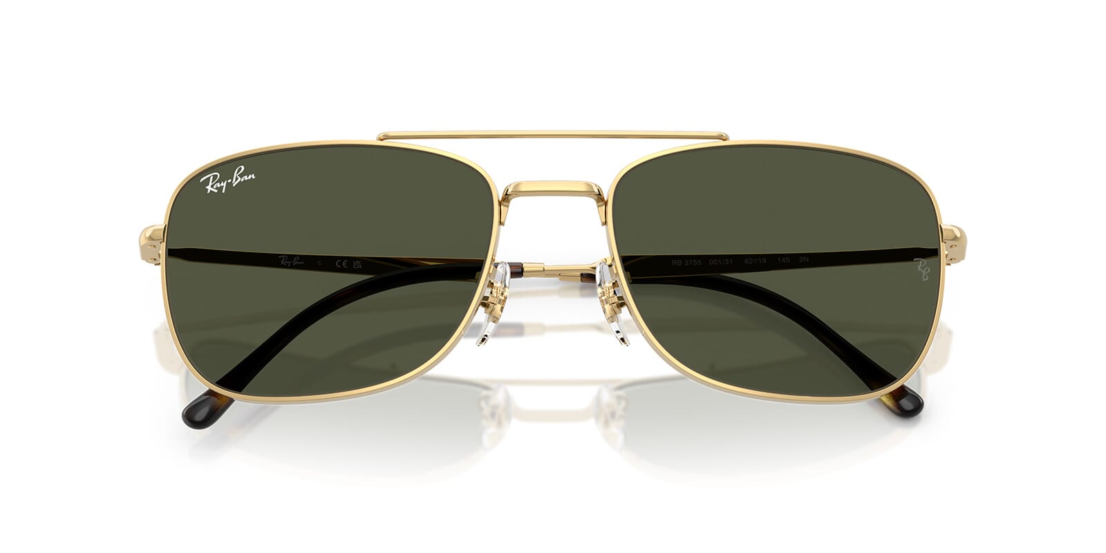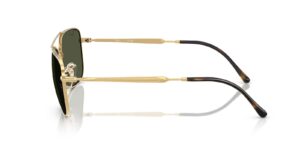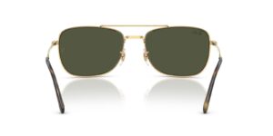 This rectangular Ray-Ban sunglass comes in a arista gold frame with green lenses.