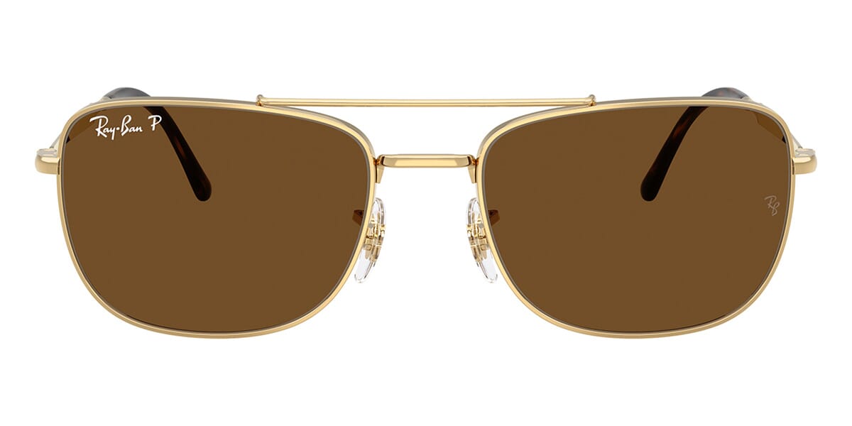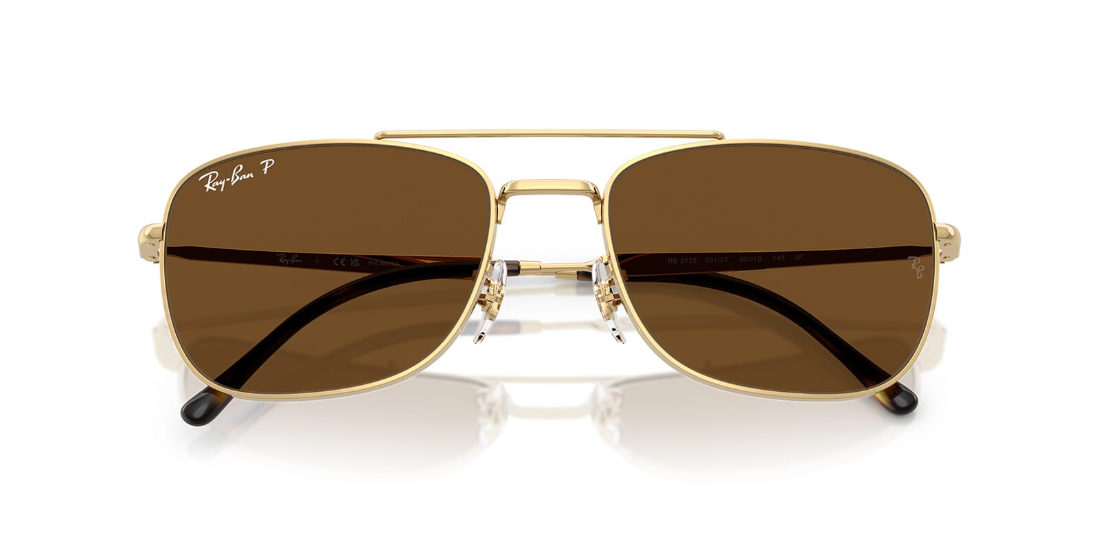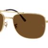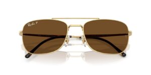 This rectangular Ray-Ban sunglass comes in a arista gold frame with brown polarised lenses.