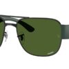 This square Ray-Ban sunglass comes in a black frame with dark green polarised lenses.