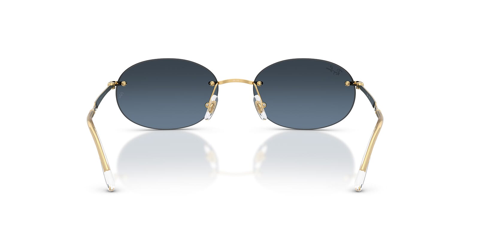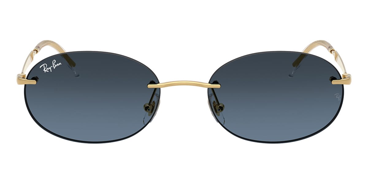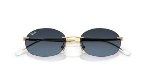 This round Ray-Ban sunglass comes in a arista gold frame with blue gradient dark grey lenses.