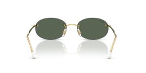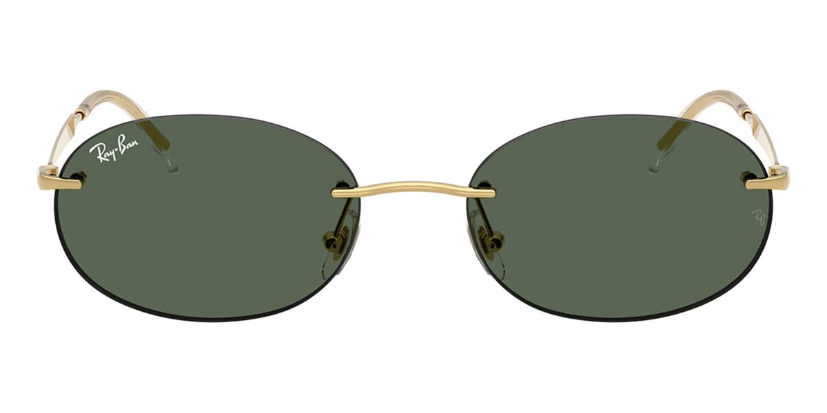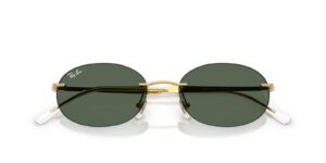 This round Ray-Ban sunglass comes in a arista gold frame with dark green lenses.