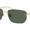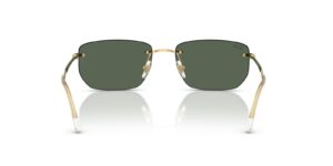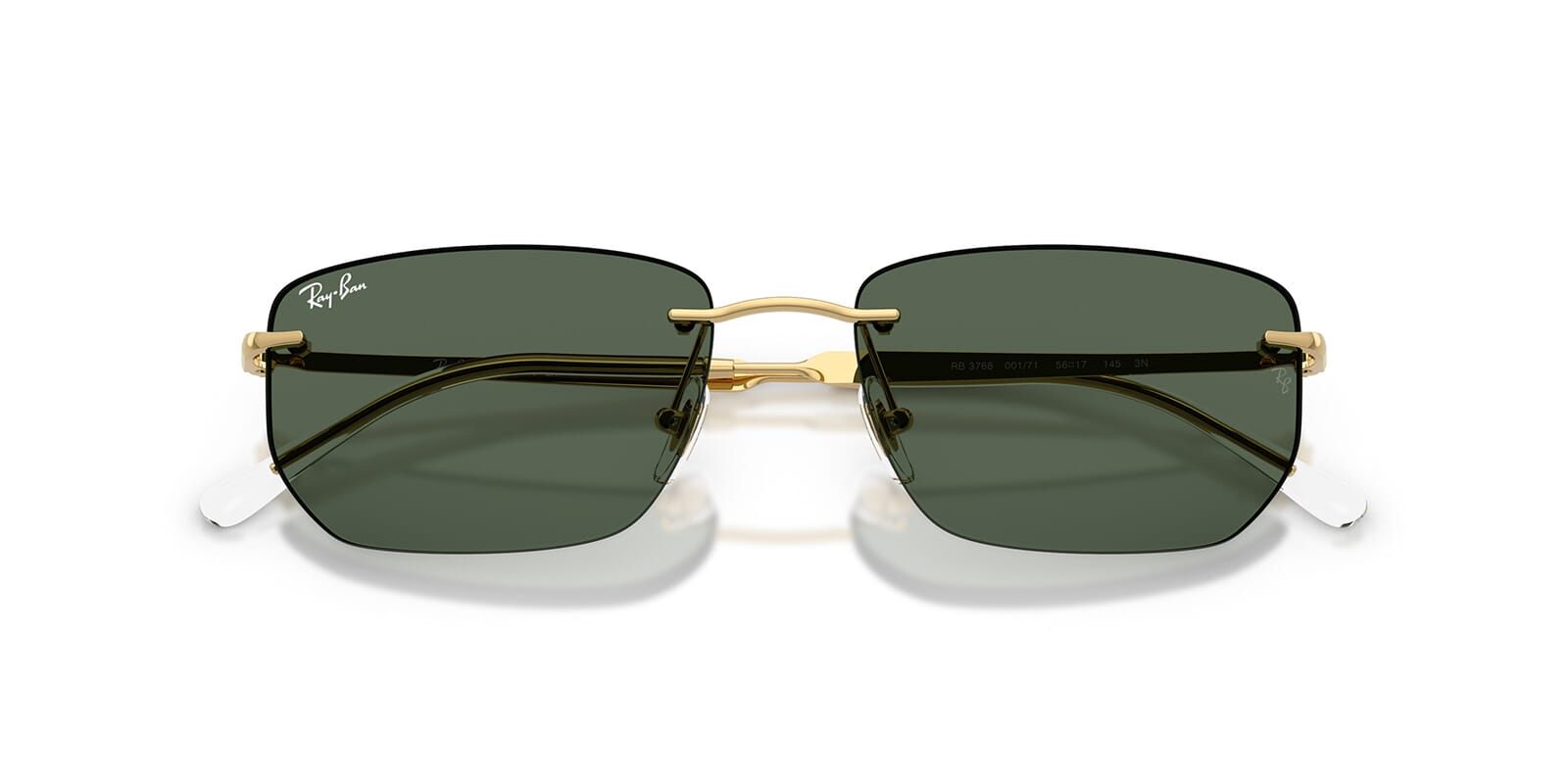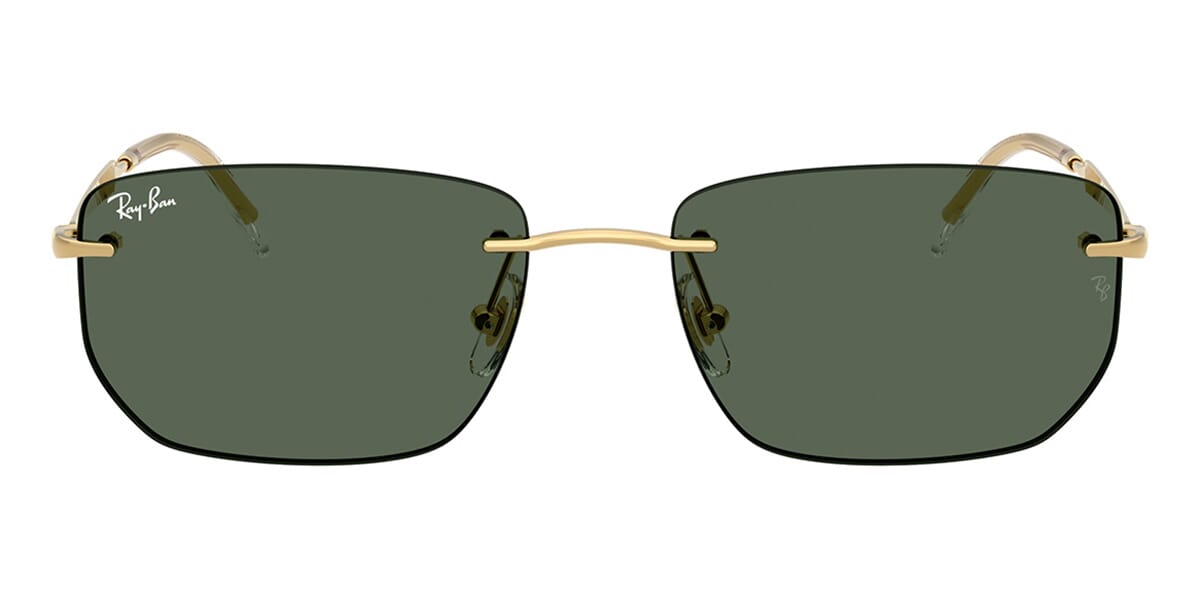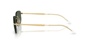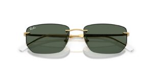 This rectangular Ray-Ban sunglass comes in a arista gold frame with dark green lenses.