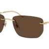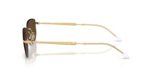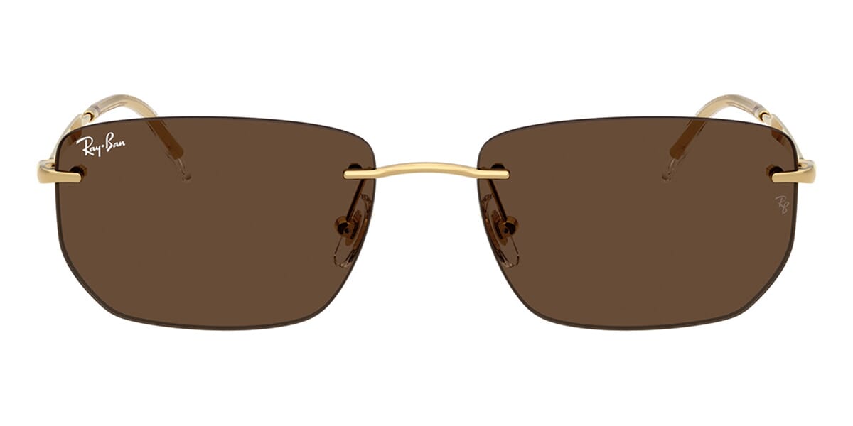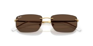 This rectangular Ray-Ban sunglass comes in a arista gold frame with dark brown lenses.