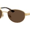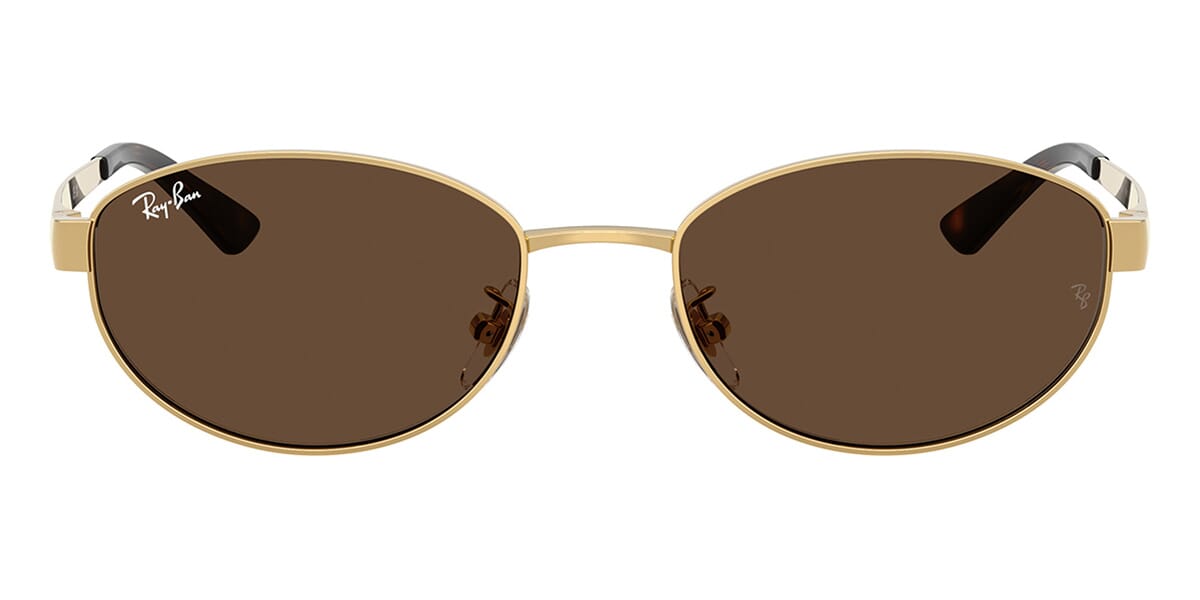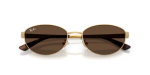 This round Ray-Ban sunglass comes in a arista gold frame with dark brown lenses.