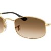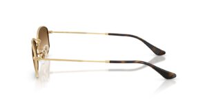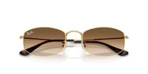 This rectangular Ray-Ban sunglass comes in a arista gold frame with brown to clear gradient lenses.