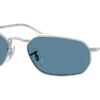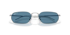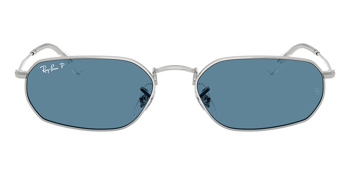 This rectangular Ray-Ban sunglass comes in a silver frame with blue polarised lenses.