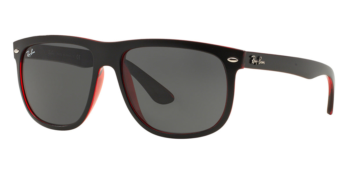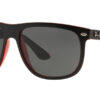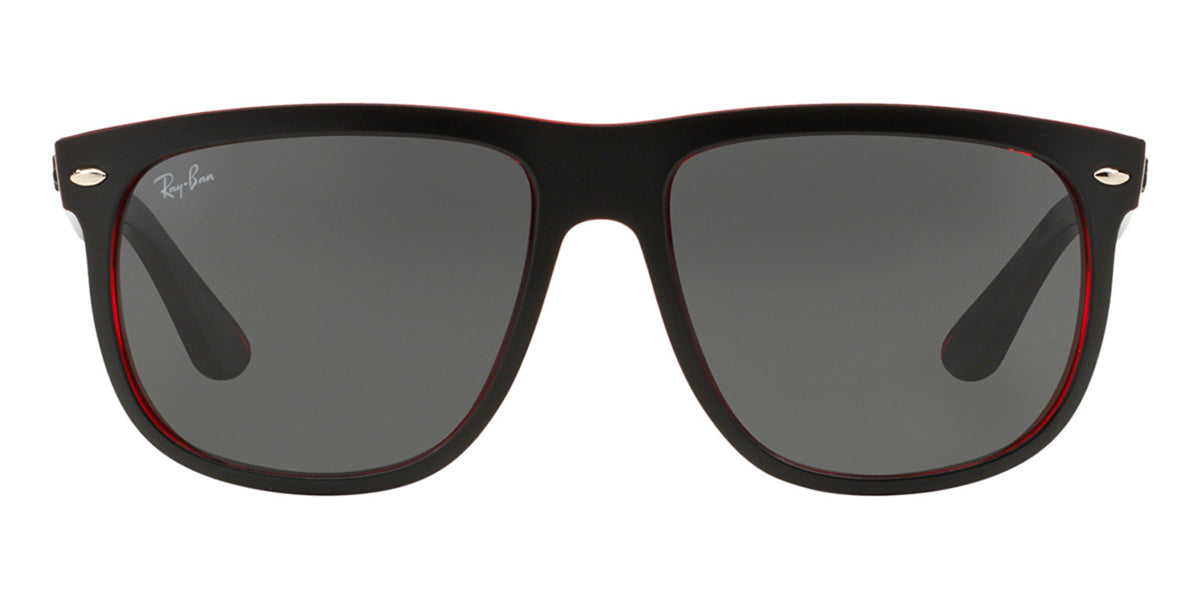 This square Ray-Ban sunglass comes in a matte black on red transparent frame with dark grey lenses.