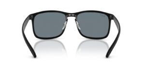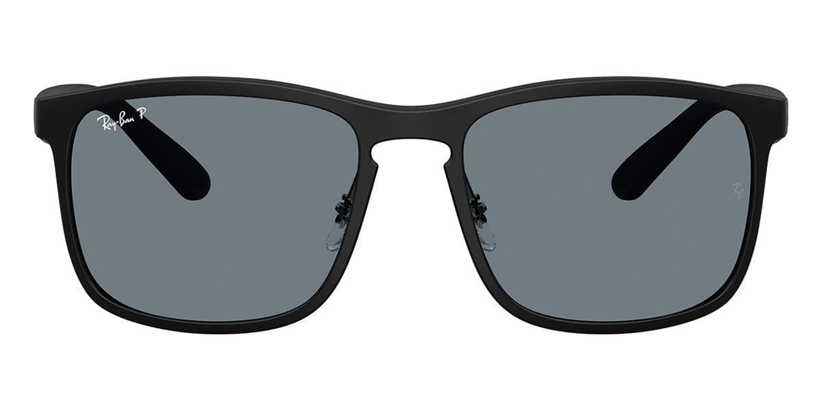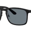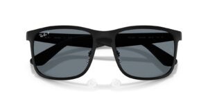 This square Ray-Ban sunglass comes in a matte black frame with blue chromance lenses.