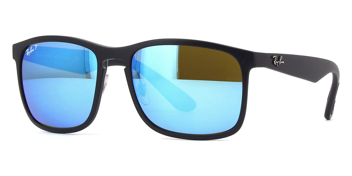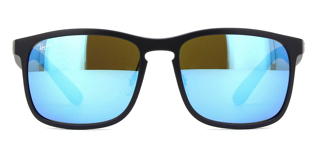 This rectangular Ray-Ban sunglass comes in a matte black frame with brown with blue mirror polarised lenses.
