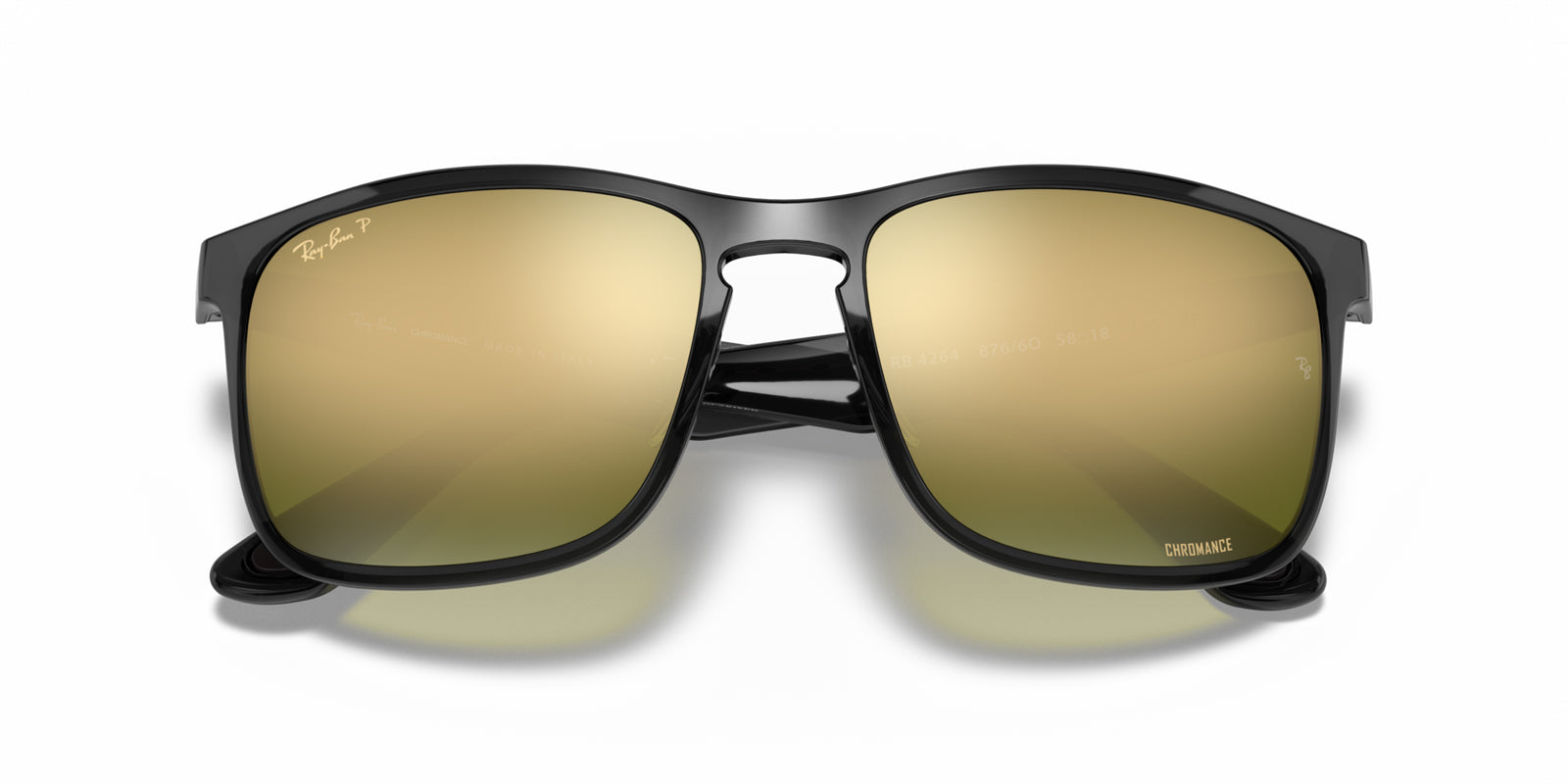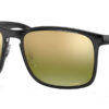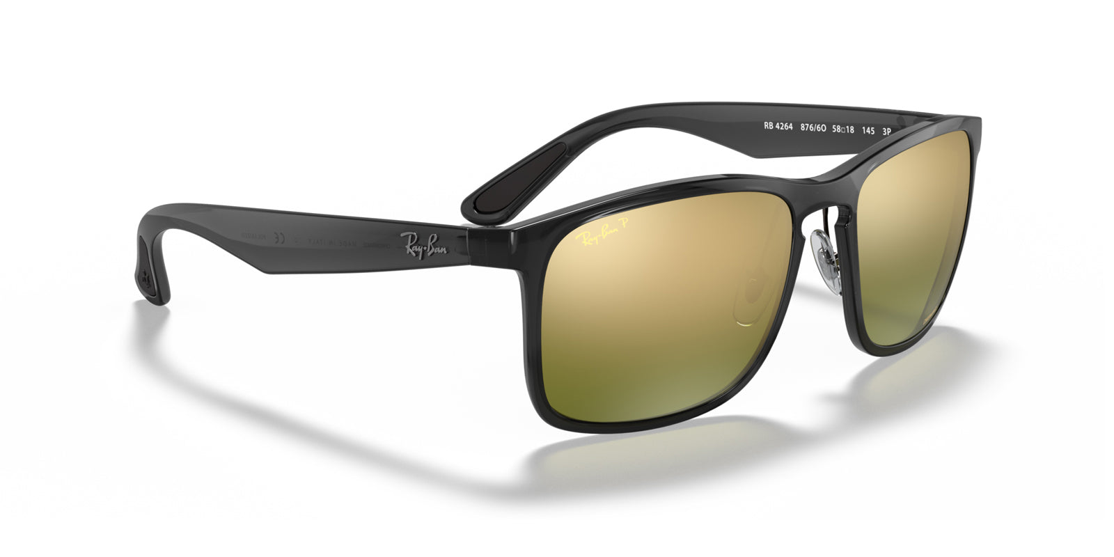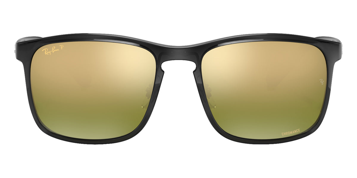 This rectangular Ray-Ban sunglass comes in a shiny grey frame with green with gold to silver gradient mirror polarised lenses.