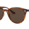 This round Ray-Ban sunglass comes in a striped red havana frame with dark brown lenses.