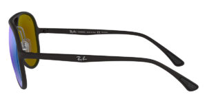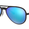This aviator Ray-Ban sunglass comes in a matte black frame with green mirror blue polarised lenses.