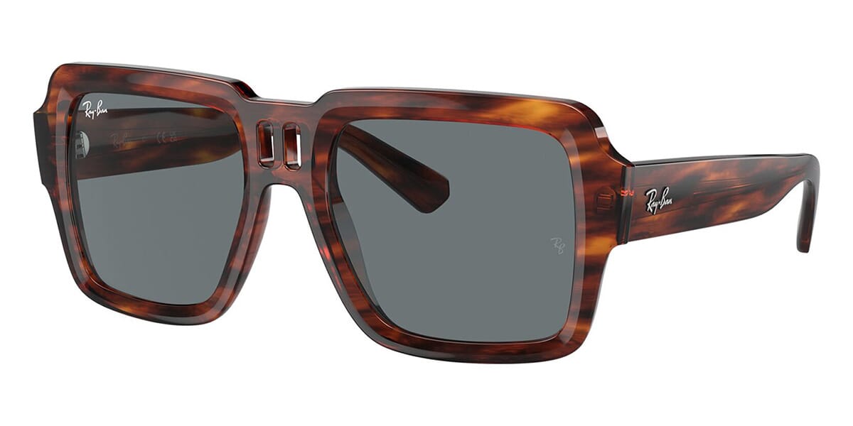 This square Ray-Ban sunglass comes in a striped havana frame with dark blue lenses.