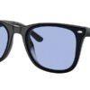 This square Ray-Ban sunglass comes in a black frame with blue lenses.
