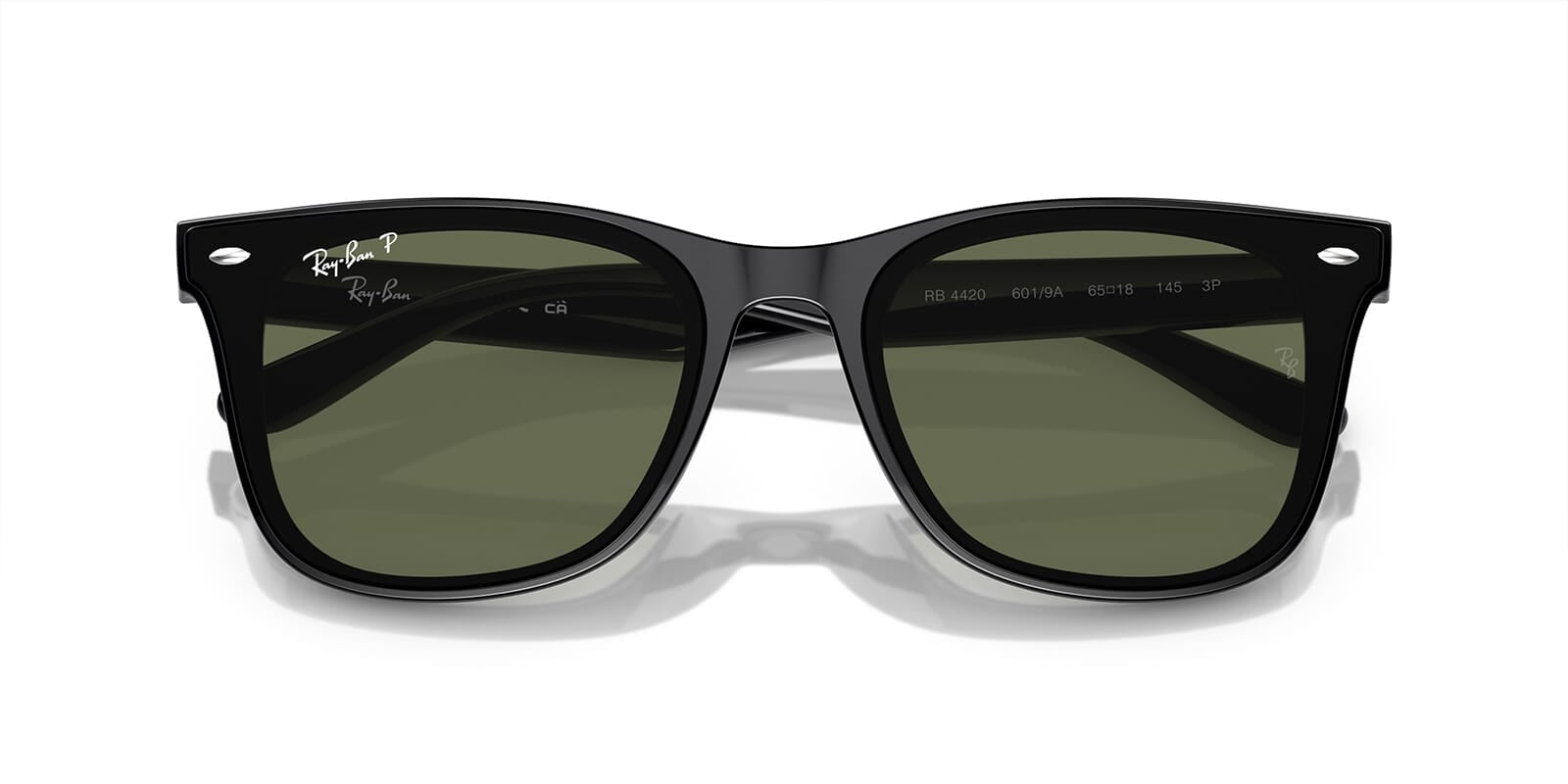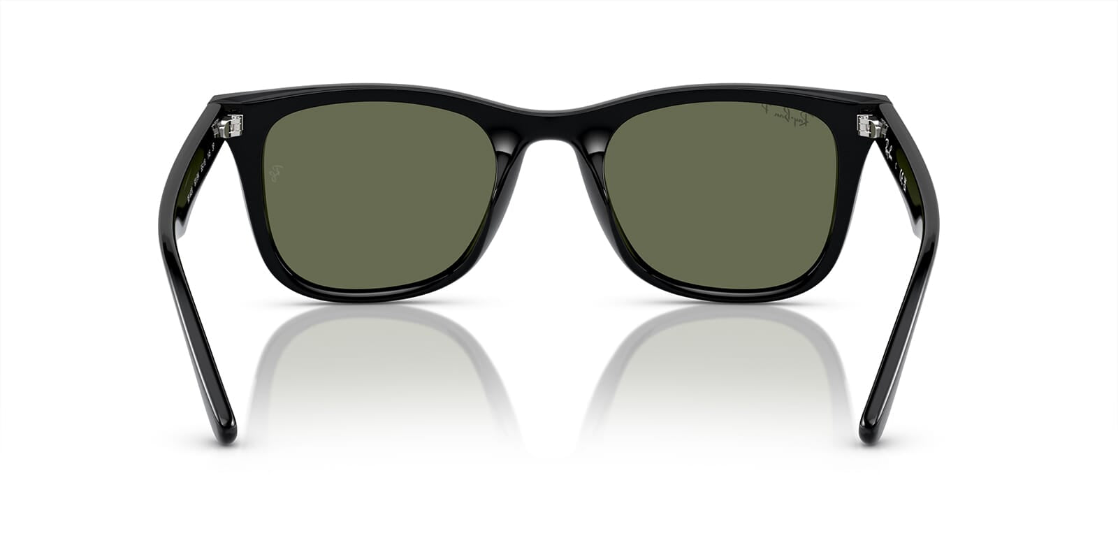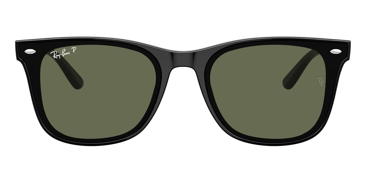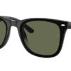 This square Ray-Ban sunglass comes in a black frame with dark green polarised lenses.