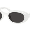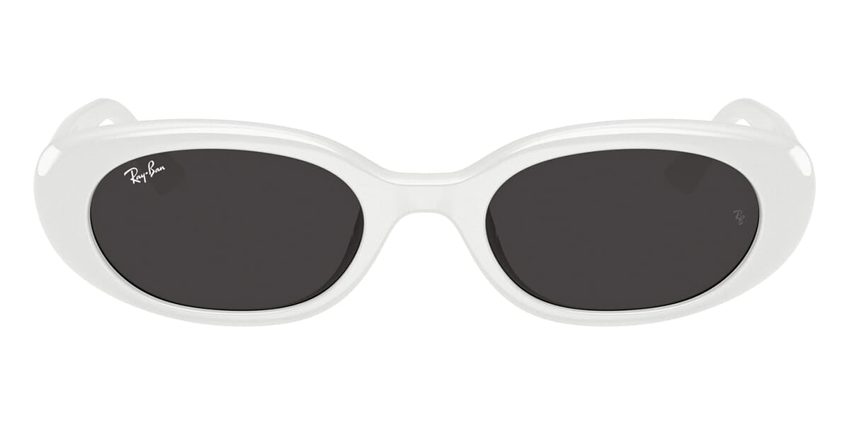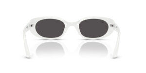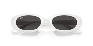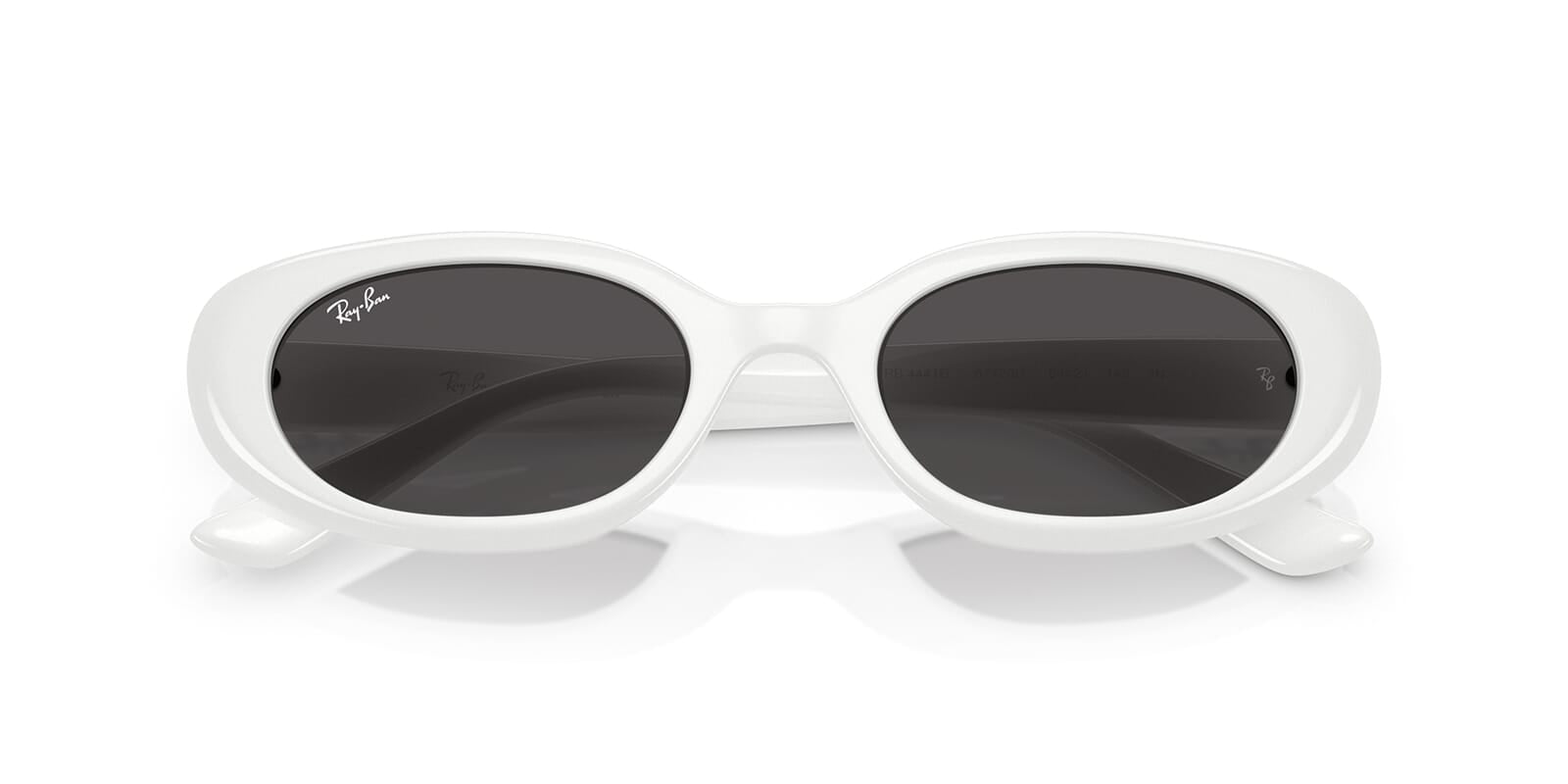 This round Ray-Ban sunglass comes in a white frame with dark grey lenses.