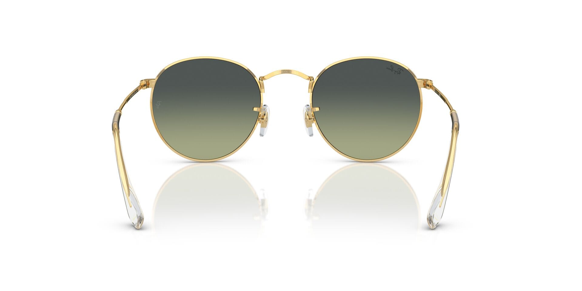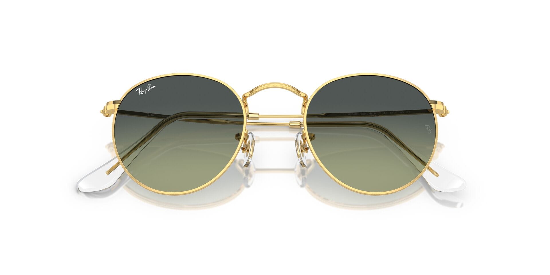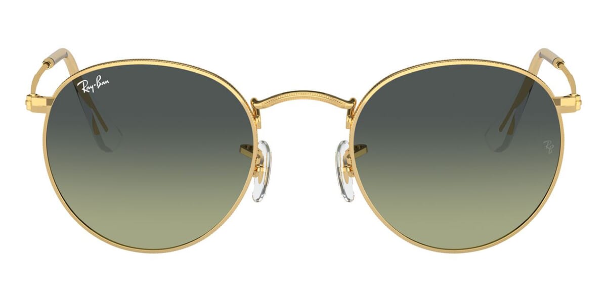 This round Ray-Ban sunglass comes in a gold frame with green vintage lenses.
