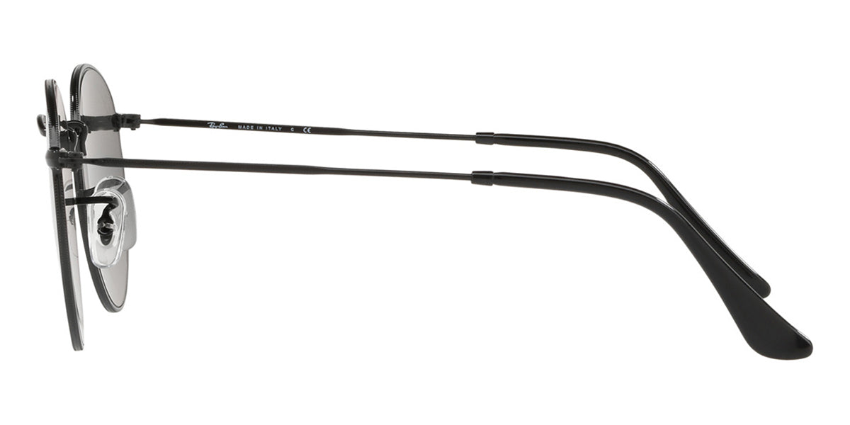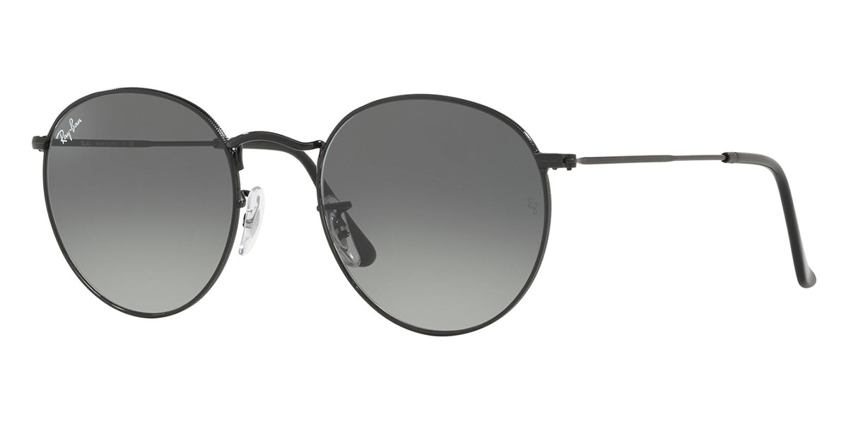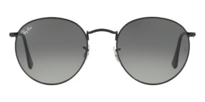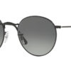 This round Ray-Ban sunglass comes in a black frame with grey gradient dark grey lenses.