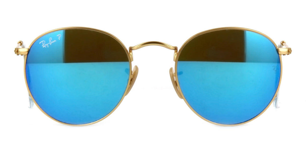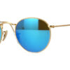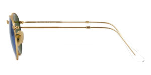This round Ray-Ban sunglass comes in a matte gold frame with flash blue mirror polarised lenses.