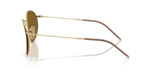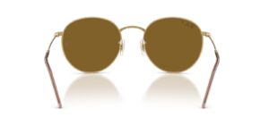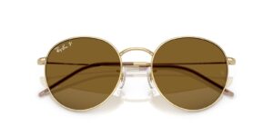 This round Ray-Ban sunglass comes in a arista gold frame with brown polarised lenses.
