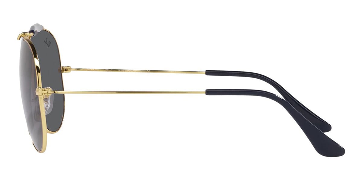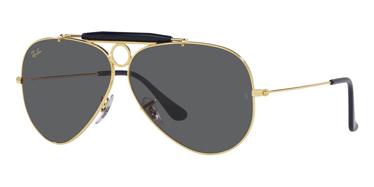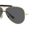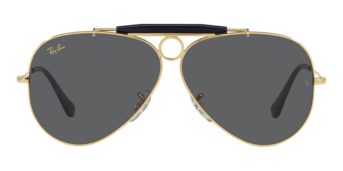 This aviator Ray-Ban sunglass comes in a legend gold frame with dark grey lenses.