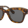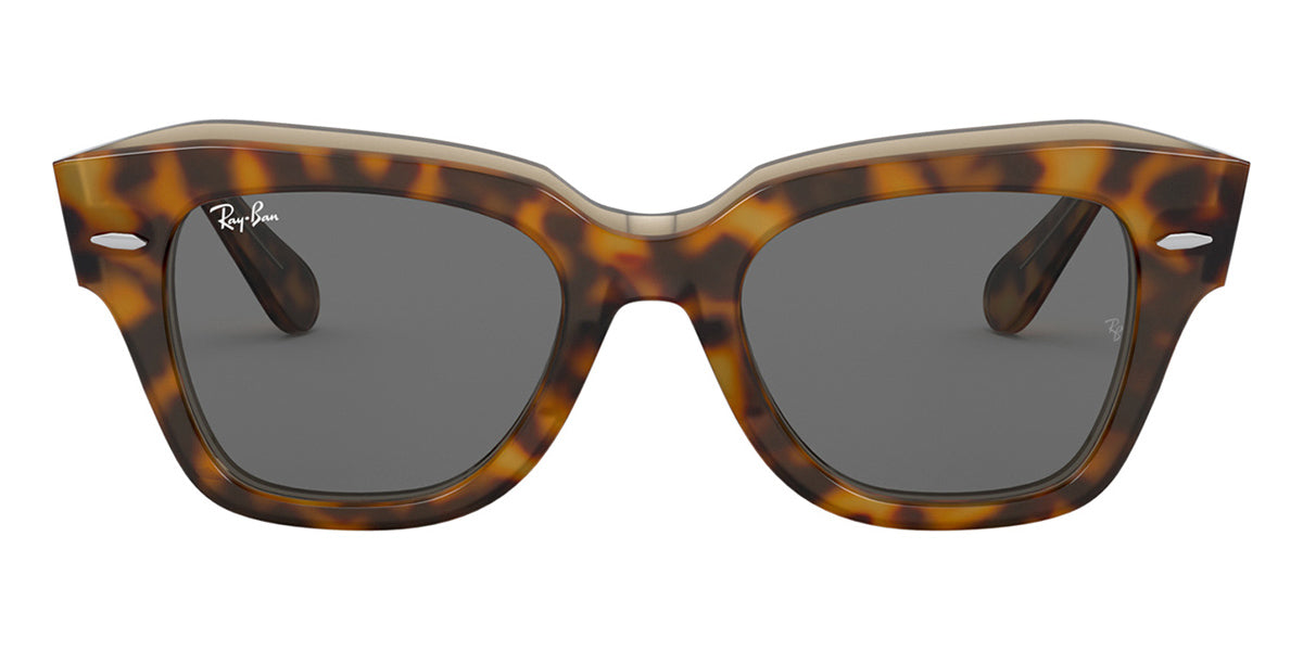 This square Ray-Ban sunglass comes in a havana on transparent light brown frame with dark grey lenses.