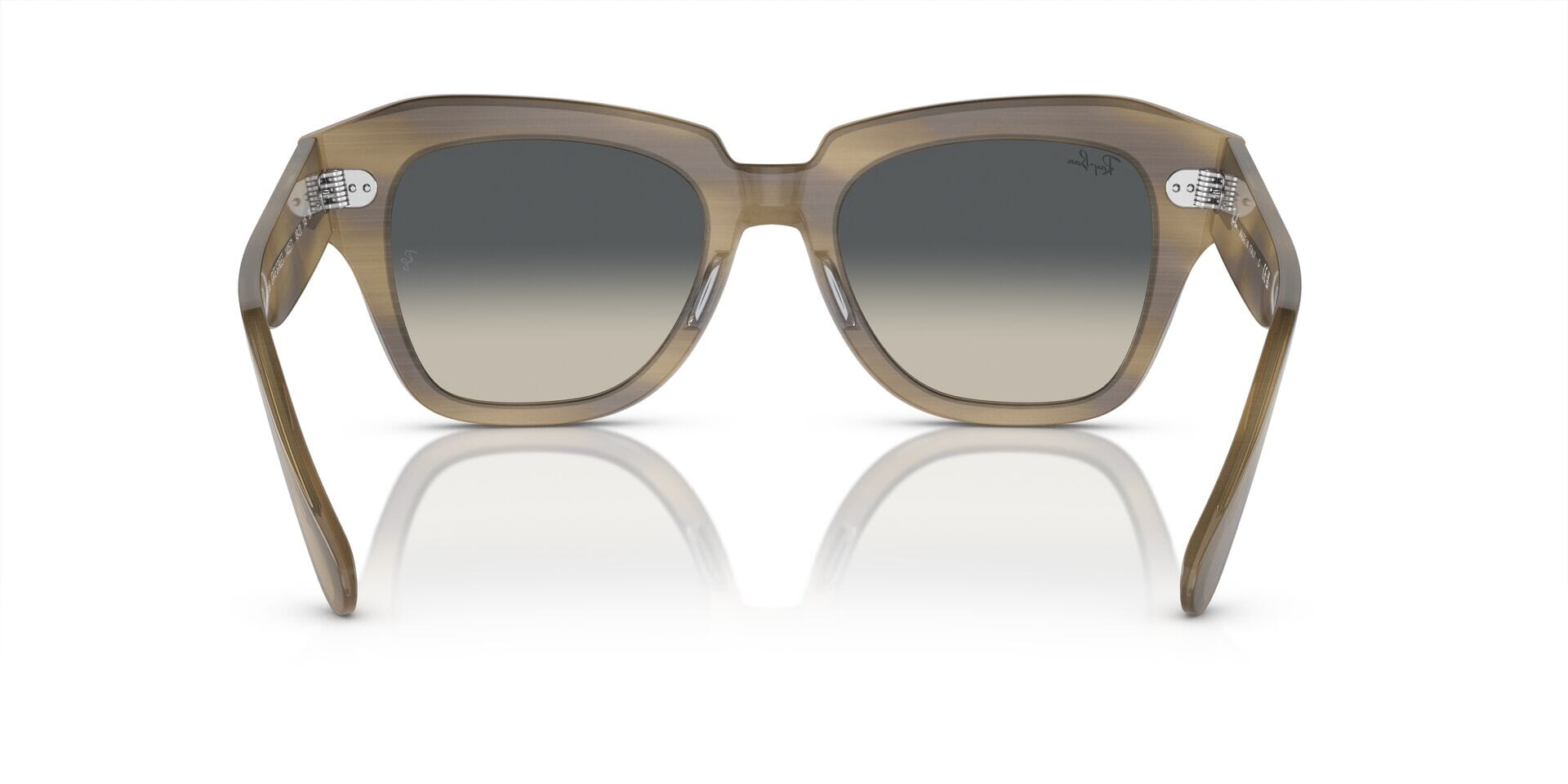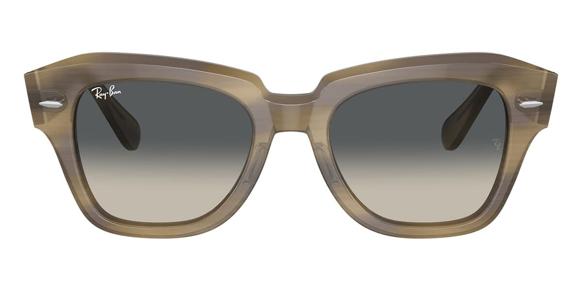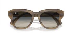 This square Ray-Ban sunglass comes in a striped green frame with grey gradient lenses.