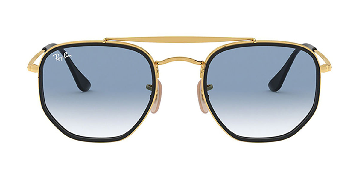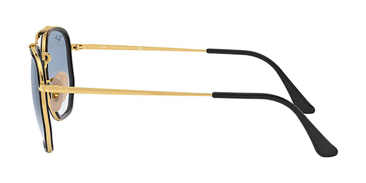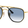 This round Ray-Ban sunglass comes in a gold frame with blue gradient lenses.