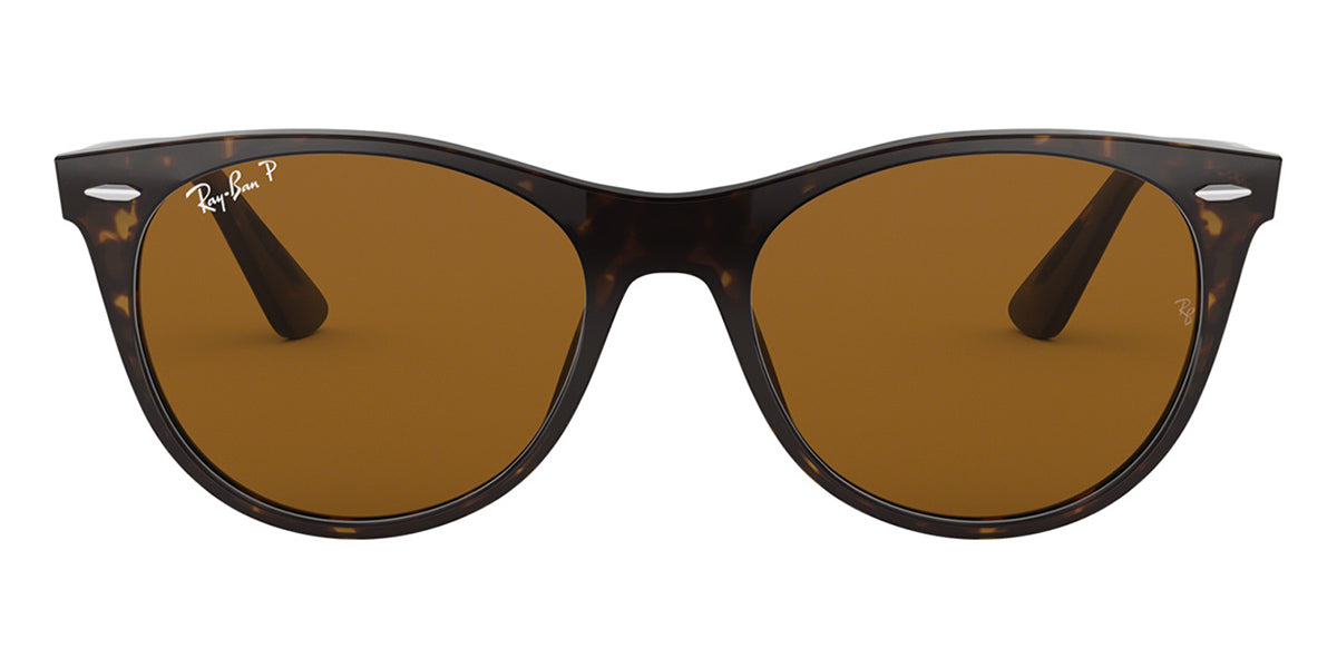 This wayfarer Ray-Ban sunglass comes in a stripped havana frame with brown polarised lenses.