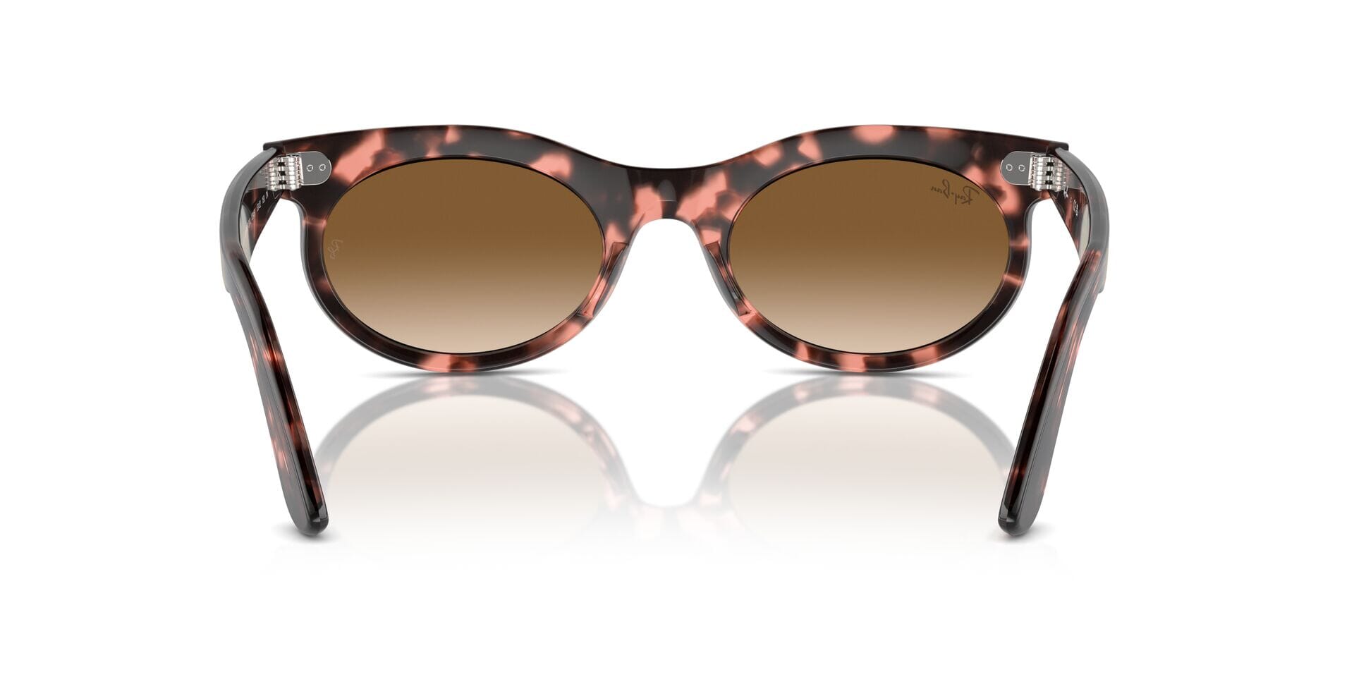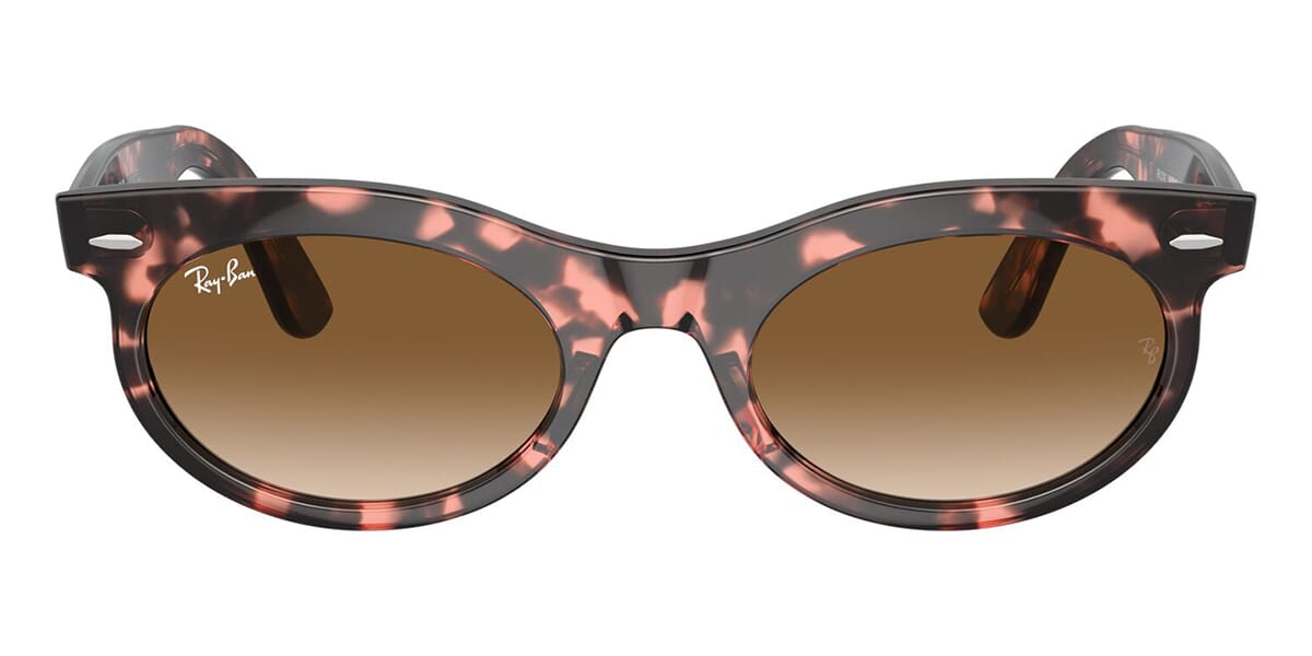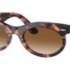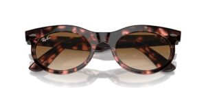 This round Ray-Ban sunglass comes in a pink havana frame with brown to clear gradient lenses.