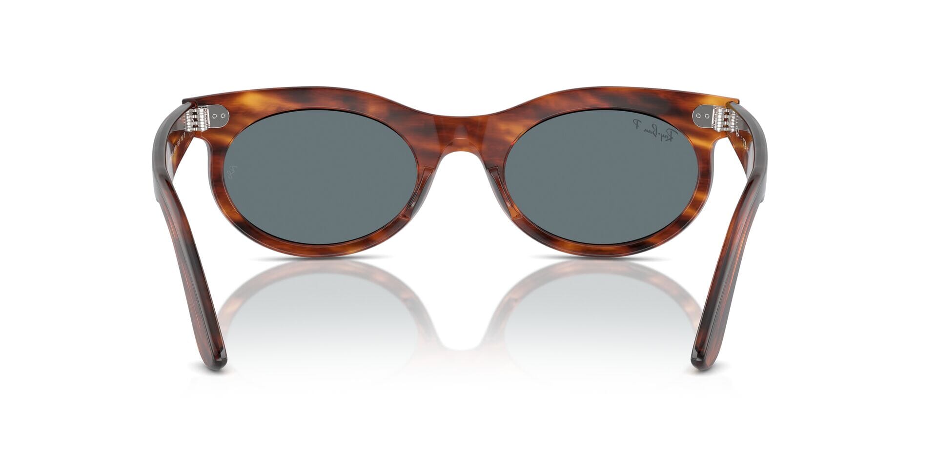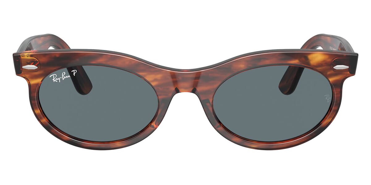 This round Ray-Ban sunglass comes in a striped havana frame with dark blue polarised lenses.