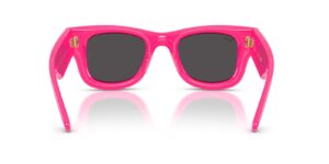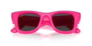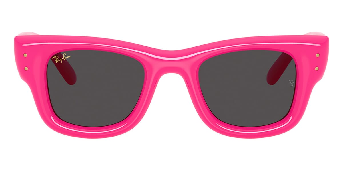 This square Ray-Ban sunglass comes in a fucsia frame with ultra black lenses.