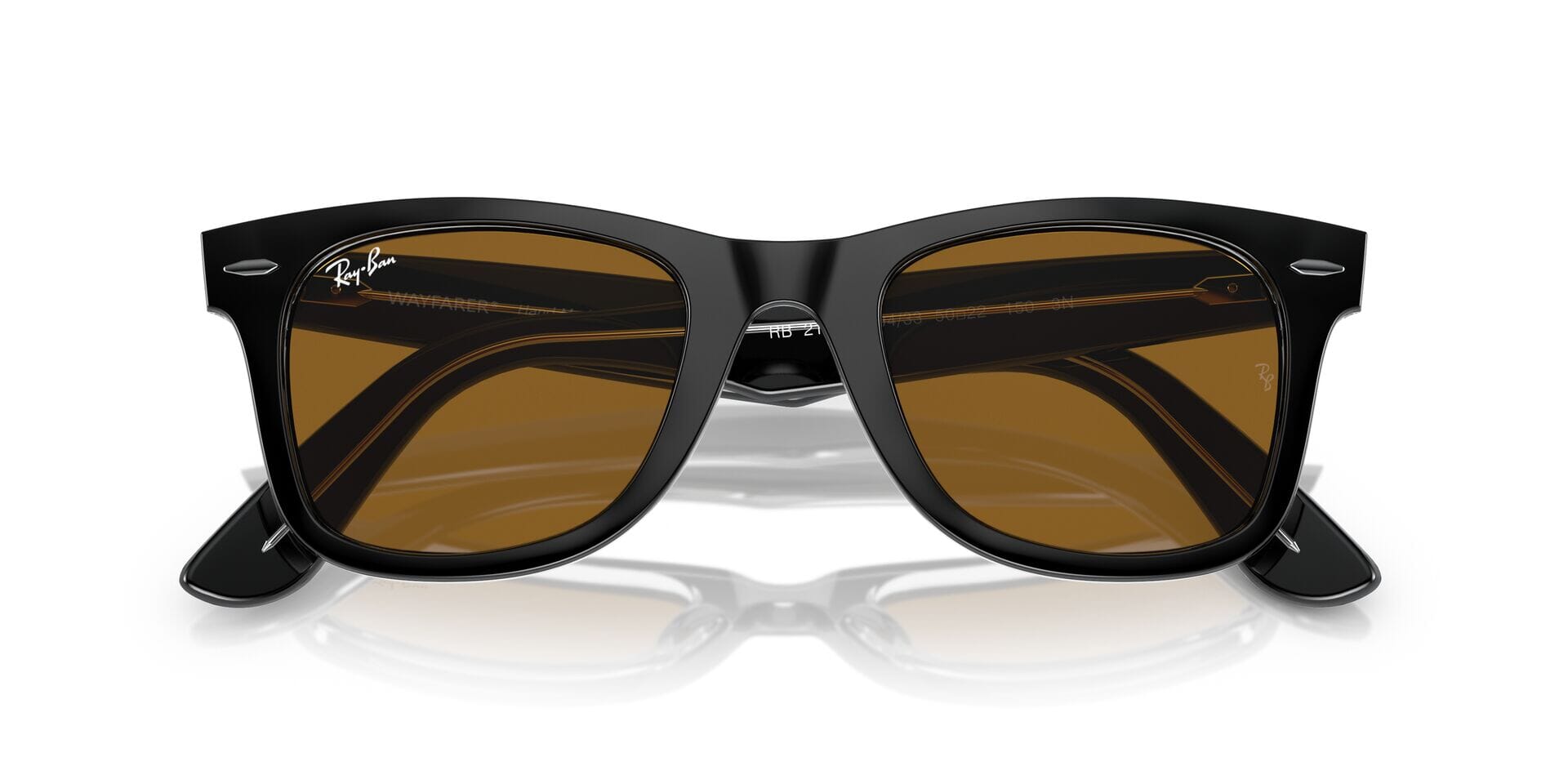 This square Ray-Ban sunglass comes in a black on crystal frame with brown lenses.