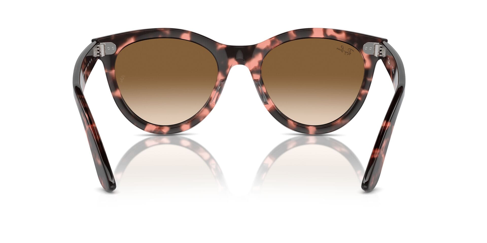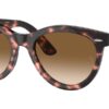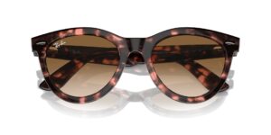 This round Ray-Ban sunglass comes in a pink havana frame with brown to clear gradient lenses.