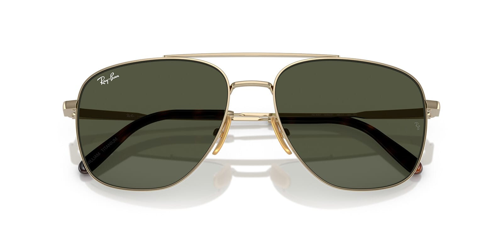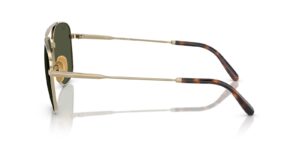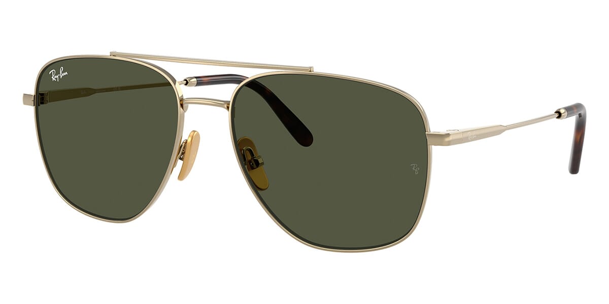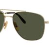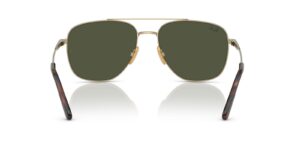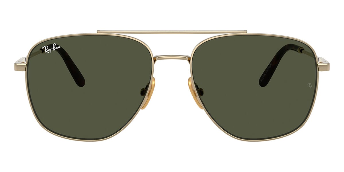 This square Ray-Ban sunglass comes in a arista gold frame with green lenses.