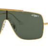 This square Ray-Ban sunglass comes in a gold frame with dark green lenses.