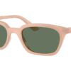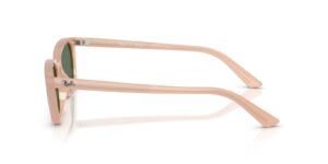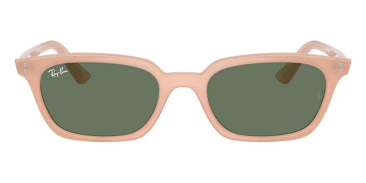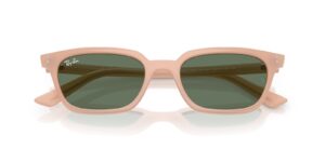 This rectangular Ray-Ban sunglass comes in a cloudy natural pink frame with dark green lenses.