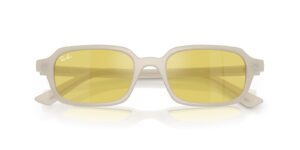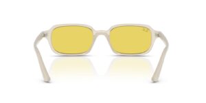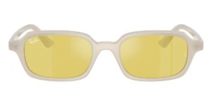 This rectangular Ray-Ban sunglass comes in a cloudy warm white frame with yellow with gold flash mirror lenses.