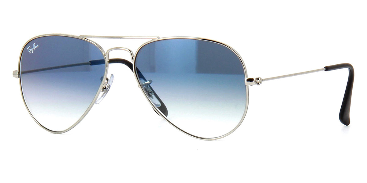 This aviator Ray-Ban sunglass comes in a silver frame with blue gradient lenses.