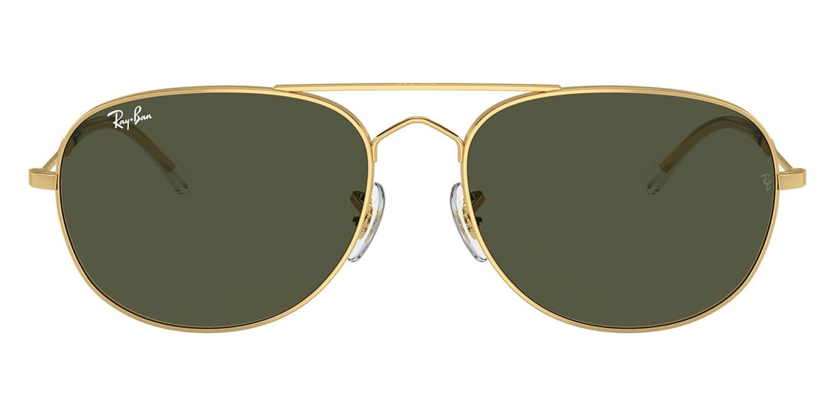 This round Ray-Ban sunglass comes in a gold frame with green lenses.