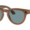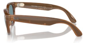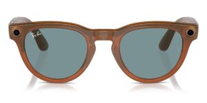 This round Ray-Ban sunglass comes in a caramel frame with teal blue lenses.