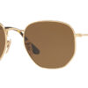 This square Ray-Ban sunglass comes in a gold frame with brown lenses.