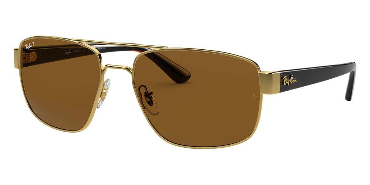 This rectangular Ray-Ban sunglass comes in a shiny gold frame with brown polarised lenses.