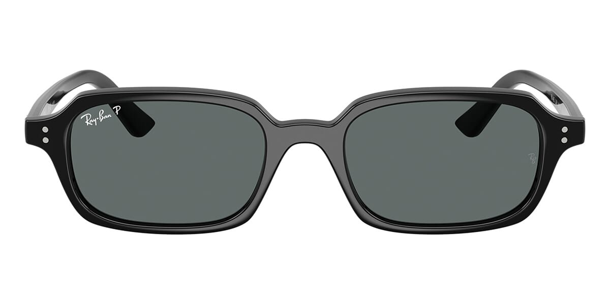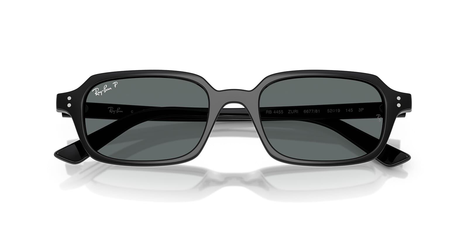 This rectangular Ray-Ban sunglass comes in a black frame with dark grey polarised lenses.